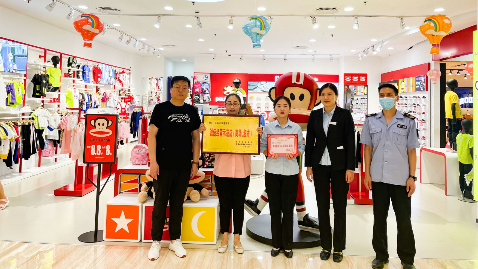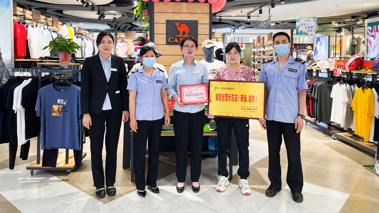 5月25日上午,长葛市市场监督管理局领导一行5人来到宇龙广场为商贸公司颁发《2020年度诚信经营示范店(商场、超市)》荣誉证书,商贸公司执行董事胡总、行政副总楚总代表公司受奖。本次荣获诚信经营示范店的还有骆驼、马克华菲、大嘴猴等商户。