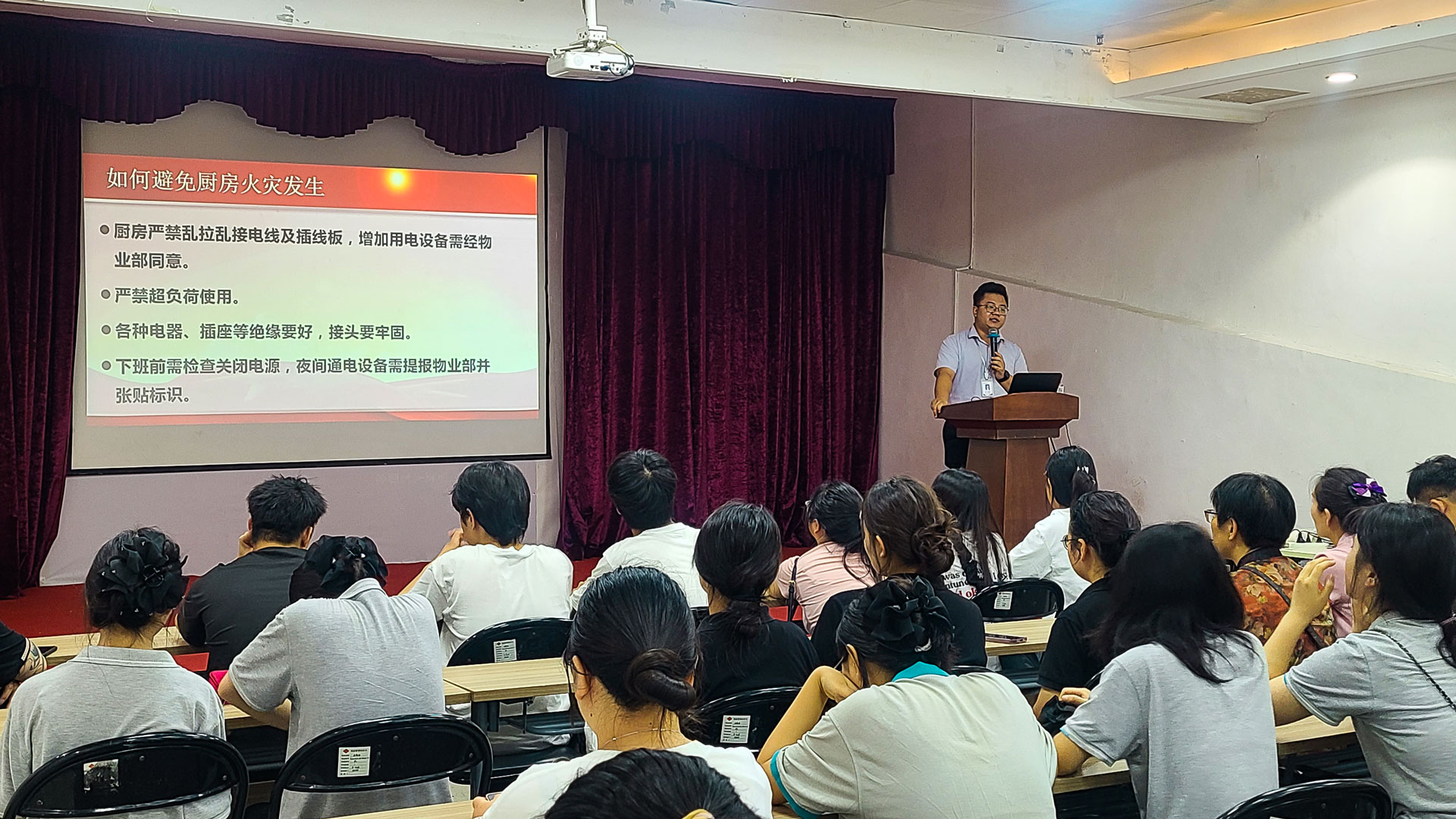 最后是在安全方面,为加强公共场所的消防安全,筑牢安全防线,进一步提高员工的自防自救能力,8月2日上午,宇龙广场组织餐饮、影院等主力店进行了一场消防安全专项培训。由物业部杨一谦担任讲师,向大家展示讲解了正确使用灭火器、灭火毯等消防器材的方法,针对影院这类人员密集场所,重点培训了员工如何引导观众有序疏散、如何保障疏散通道畅通无阻等关键救助技巧。