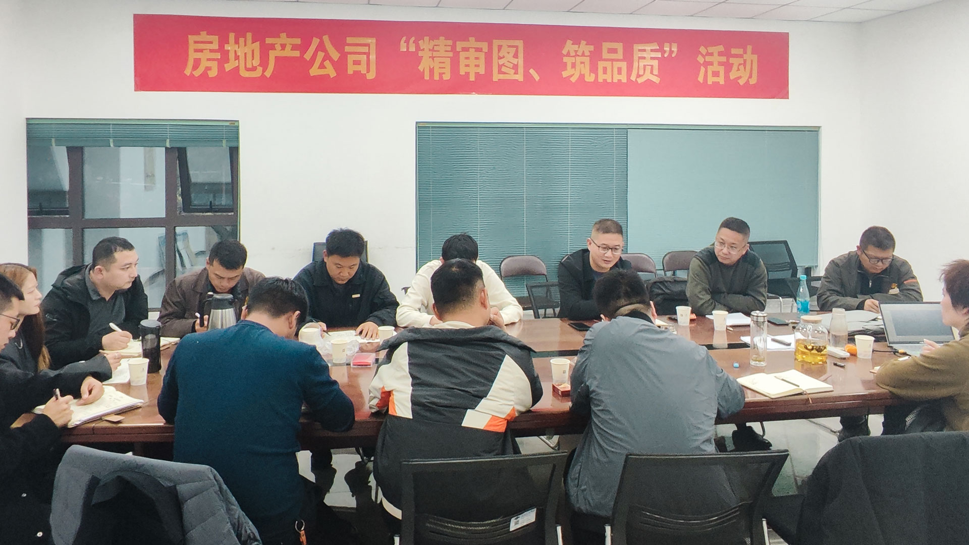 11 月 13 日下午,房地产公司在龙湖御府售楼部二楼会议室召开 7#、8#、10#、11#楼安装图纸审图结果发布会,总经理徐国翔及工程条线全员参与。